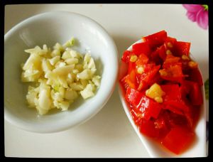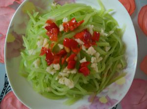 笋丝里调入盐、鸡精、香油拌匀。放上蒜碎和辣椒圈。