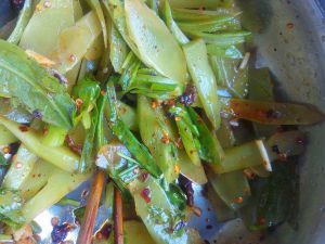 莴笋捞出来后过凉水,沥干水份,放入碗中。切葱花和蒜末,放在莴笋丝上面。锅中热油,然后浇在蒜蓉葱花上,这样可以使得大蒜更香,也不会那么冲,生蒜吃了嘴里味道比较重。