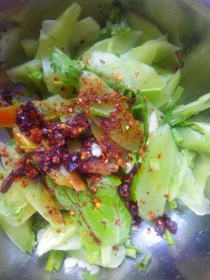 放入葱,蒜,香菜,香油,酱油,老干妈肉丝油辣椒,不放一样可以,我还感觉不够辣,放了一些辣椒粉