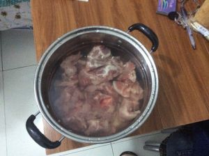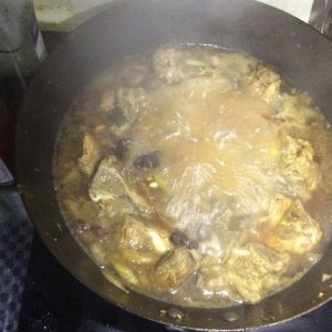 再翻炒1-2分钟,放生抽,翻炒均匀,然后放入开水,中小火慢慢煮一个小时左右!