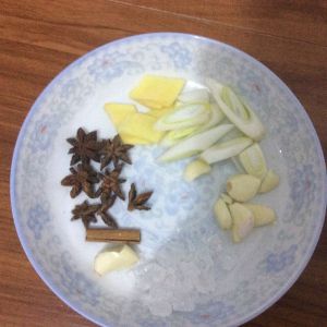 锅内倒入清水(水量刚好没过排骨)放入所有香料:八角,、桂皮、香叶,接着放入所有调味料:味达美臻品料酒2勺、六月鲜特级原汁酱油4勺味达美初榨原酿生抽2勺