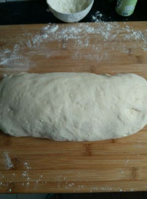 干酵母加入温水中化开,倒入面粉中,加入两勺奶粉,用筷子搅拌成絮状,用手揉至表面光滑的面团(有面包机的话直接将食材放入面包机里)