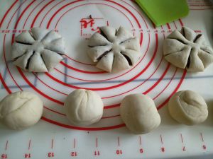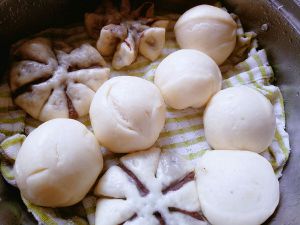 将发酵好的面团随意切成大小差不多的馒头,然后我拿了两块来包豆沙,其余就是白馒头啦,给我女儿吃什么都不加!然后放入加有50-60度热水的锅子第二次发酵!大约20-30分钟!体积膨大些,然后开中火上气了以后大火蒸15分钟,然后关火,静待5分钟,开锅就可以吃啦!
