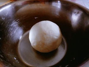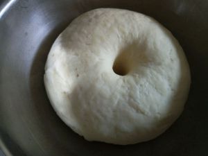 将面团用湿毛巾盖住,这几天温度不是很高,我就倒入50-60度热水到锅子里,把面团放入,大约1小时左右发到2倍到,然后用手指戳洞不回缩!