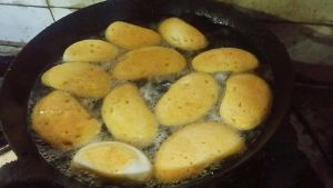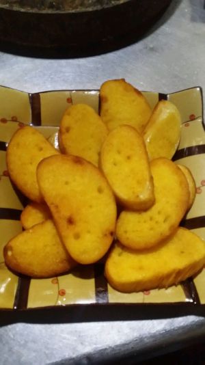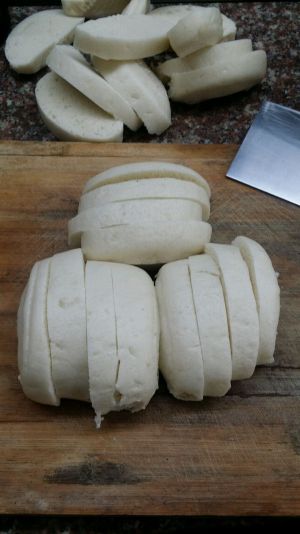锅里倒入油,大概7成热,然后放入浸泡好的馒头,两面炸金黄即可