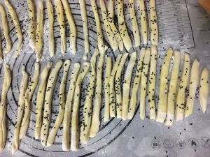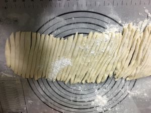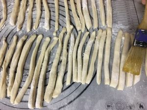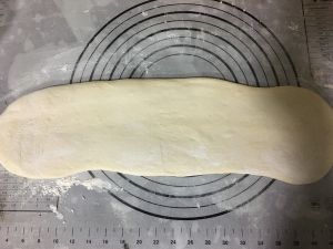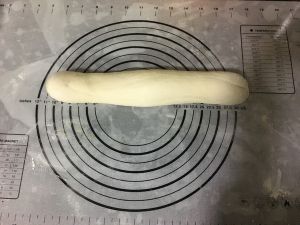 取出面团,用力揉匀揉透排除气泡,搓成如图长的粗条。
