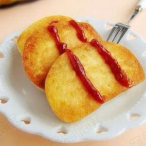 待油烧热,馒头片沾上蛋液下锅煎,两面金黄即可,淋上番茄酱