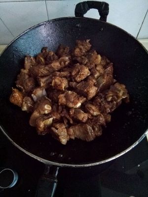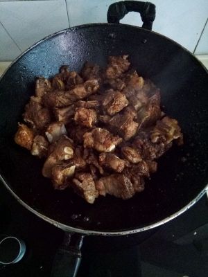 继续翻炒至小排表面略微焦黄,此过程可使小排逼出一些油脂。