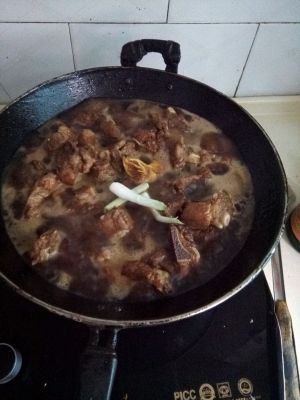 加入料酒一勺,酱油二勺,糖三勺