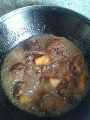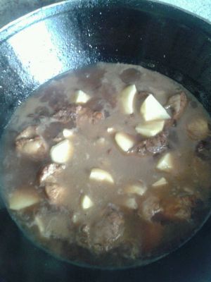 放入土豆、白薯,添水,放花椒、大料、糖、盐,大火烧开。