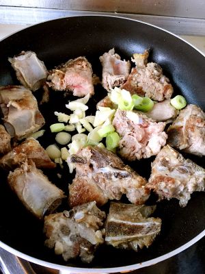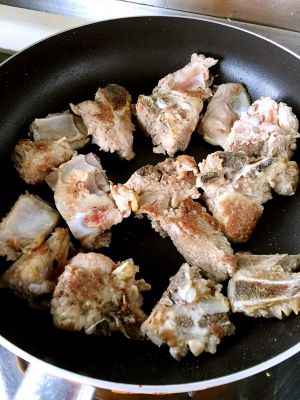 将排骨洗净,在水里焯一下备用!锅里少许油,一热就把排骨放进去