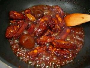 熬糖。锅中倒入少许油,油不要太多,比平时炒菜稍多一点即可,放入冰糖熬至完全融化。注意一定要用小火,冰糖在热油中会变得很松脆,可以用勺子轻轻敲碎,这样化得比较快,等到焦糖的香味出来就行了,不要熬得太久。