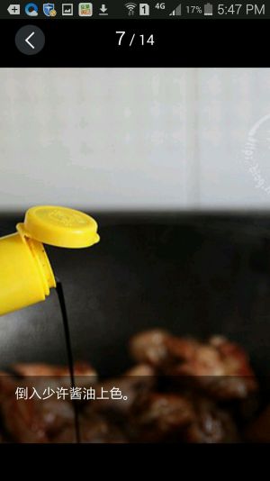 4:接着倒入酱油,放入八角,桂皮,香叶和葱姜片,倒入料酒继续翻炒。