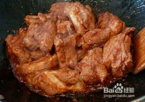 上色。把焯好的排骨倒入锅中翻炒均匀,不够红可加入适量的老抽,注意刚熬好的糖油温度很高,排骨下锅时小心热油溅出烫到噢