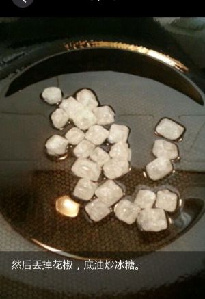 2:炒锅放油,油温2成热时下入冰糖或者放1.5汤勺白糖,小伙炒制融化,微微起泡。
