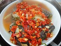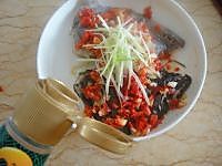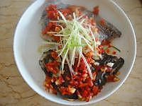 利用蒸鱼的时间切葱沫,姜沫,蒜末。鱼头蒸好后,倒掉一部分汤汁(因为这个汤汁有鱼腥味,加上水蒸汽太多了,所以倒掉一些),放剁椒在鱼头上面,让把切好的,姜末葱末蒜末放上面,浇两勺蒸鱼豉油