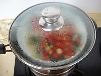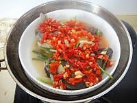 放上两勺红剁椒,少撒一点点盐即可,因为剁椒里面本身就有盐。红剁椒不辣,如果喜欢辣的可以买青剁椒,或者把泡椒切碎撒在上面。