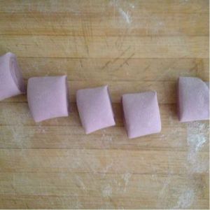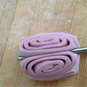 紫薯洗净,蒸好,放凉,去皮压碎和面粉,加入干孝母,和好放一边,等发。