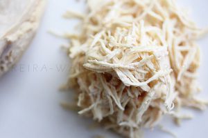 用擀面杖,把鸡肉敲松!去皮,把鸡皮切成丝。拍松的鸡肉撕成丝。ps.请按照鸡肉的纹路撕!