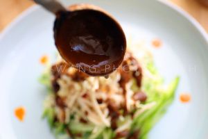 将花生酱放入小碗中,分次加入香辣口味沙拉汁搅拌均匀,再加入糖、生抽搅拌均匀。