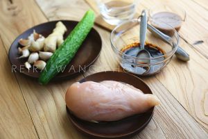 小锅中放入姜片,料酒,将鸡胸肉放入烹煮。1块300克的鸡胸,从水开后中火煮10-12分钟即可,煮好后不必急着取出。关火待稍焖一下取出,静置一会儿;