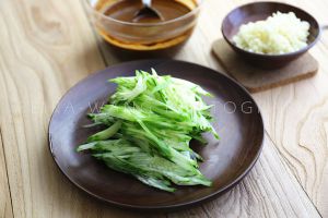 接着黄瓜洗净切丝、蒜剁蒜泥备用;