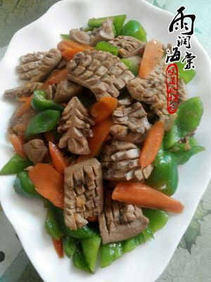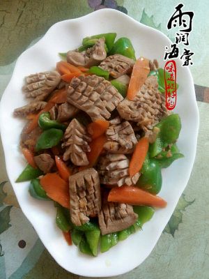 用锅内余油将葱姜蒜煸出香味,放入青椒、洋葱、少许盐,翻炒片刻,倒入腰花,再放生抽、鸡精,再翻炒均匀,即可出锅盛盘。