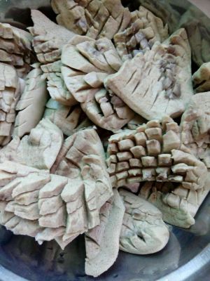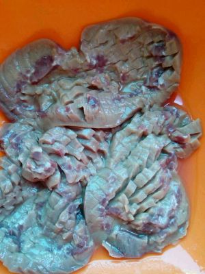 先将腰子切成坡刀.切到3/4.不要切到底。
