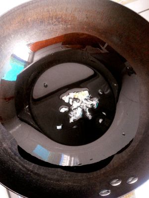炒锅内放入玉米油,再加入蒜末爆出香味。