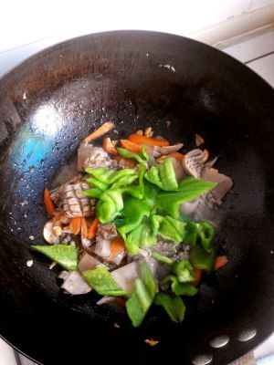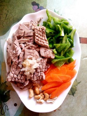 将青椒去除辣筋后切成片,胡萝卜切片,蒜拍成末,再来几粒腰果仁,也可以不放。