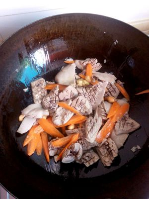 泡椒切段、形状随意、切自己喜欢的形状,泡姜、蒜切丝,葱切长段。另取一小碗,里面调入湿淀粉、白糖、味精、生抽,兑成芡汁。