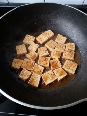 豆腐切成骰子块(要是怕豆腐碎掉,切好以后用水抄一下)