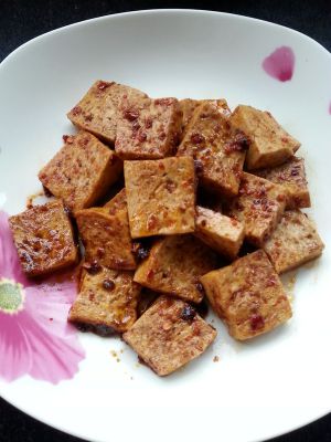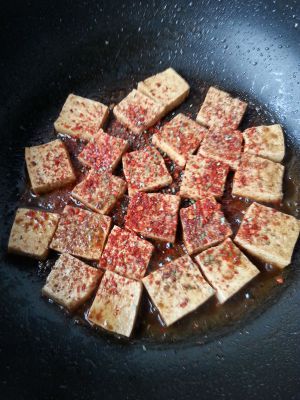 坐锅开火倒入香葱辣油,油发热时,放入麻椒,(由于放入麻椒较多,可以炸的差不多时,把麻椒捞出),放入葱姜蒜末,煸炒出香味,将豆腐贴锅边放入锅内,要不时的掂起来转锅,防止粘锅或者糊了,盐鸡精味精根据自身口味放。当贴锅那面成金黄即可反过来贴另一面了,同样另一半也成金黄色,