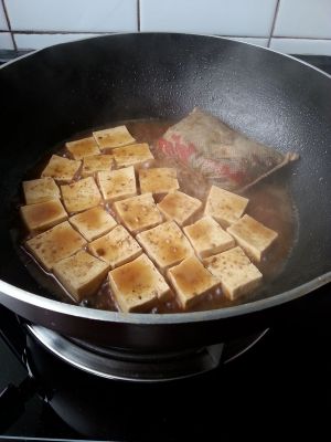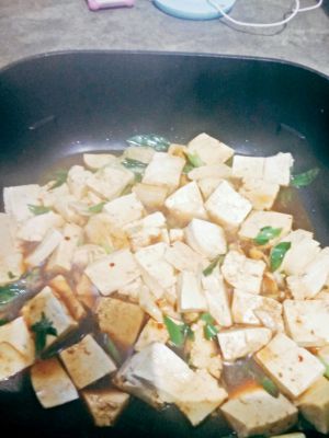 豆腐开始下锅喽,根据个人口味加调料吧,盐,鸡精,十三香,味精,都是家里常见的调料