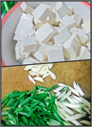葱切段,蒜切片,豆腐切块