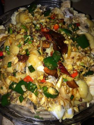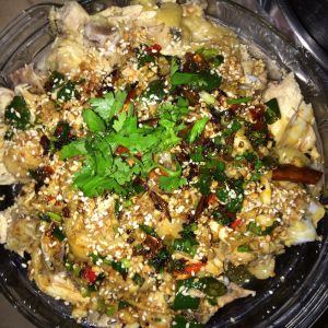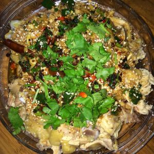 2:干辣椒和花椒爆香捞起倒入斩好的鸡肉里,锅里留油,3:下指天椒,葱,蒜蓉,姜蓉,炒香,另外拿个碗把蒜末和姜末还有葱花香菜放一起,倒点麻油,一勺醋,酱油,糖,蚝油,调匀倒入步骤3里,