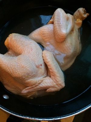 烧开水,锅中放两片姜再下光鸡,中间翻几下,煮20一30分钟起锅。