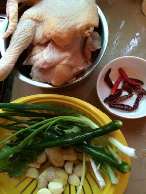 1:鸡一整只,凉水加八角花椒跟姜片料酒水量墨过鸡煮开,煮10分钟,关火焖15分钟,用筷子插鸡腿部位留清汤就熟了,然后冻好的冰块加水,把鸡放冰水泡凉晾干斩块。