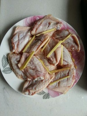 用料酒腌制鸡翅10分钟左右,生姜切丝放在鸡翅上一起腌制,去味