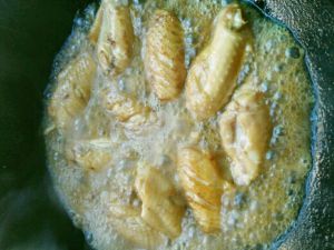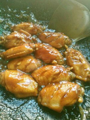 大火先煮2分钟,不停的翻转鸡翅。然后小火慢慢收汁,继续不停翻转。