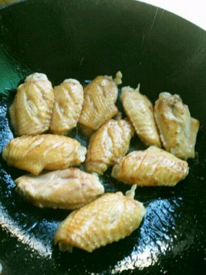 铁锅中放入一层薄薄的底油,下入鸡翅煎至两面金黄