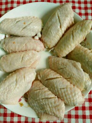 鸡翅的表面划上两刀,用些许酱油腌制半小时可以更入味。