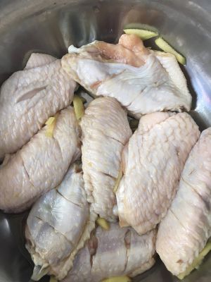 锅中放入清水,加入姜片和料酒,冷水放入鸡翅,焯水煮出血沫捞出