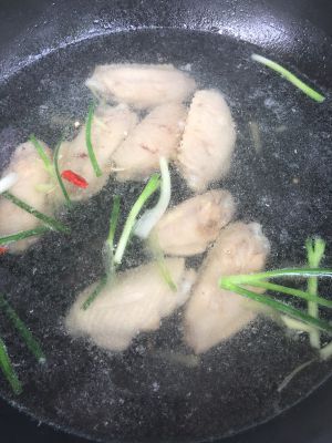 腌好的鸡翅加葱白辣椒放入清水中煮开捞出