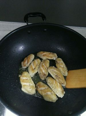 锅中放两勺油,将鸡翅放入,盖上锅盖,小火煎至两面金黄