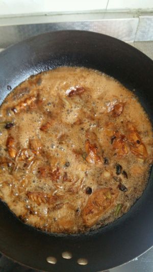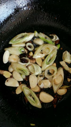 锅内留少许油,放入葱段蒜片姜片干辣椒段花椒大料,炒出香味放入翅中。
