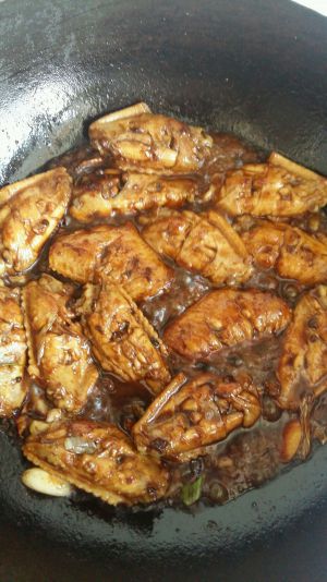 等爆香后放入鸡翅,放少量老抽,煎金黄色。