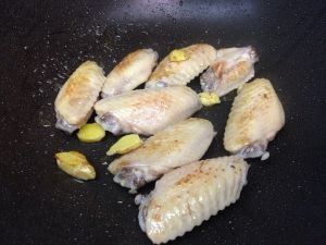 锅里加少许油,五成热时放入鸡翅,煎至两面金黄。