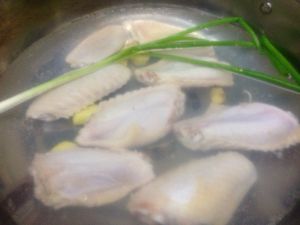 鸡翅洗干净在与姜块、葱一起放入纯净水里煮沸,煮沸后再煮5分钟。然后捞出沥干备用。