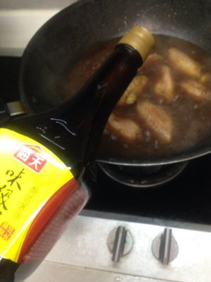 再加入酱油约3勺的量,然后盖上锅盖大火煮至收汁。汁液浓了后转小火再翻炒下,以免鸡翅糊了影响囗感。